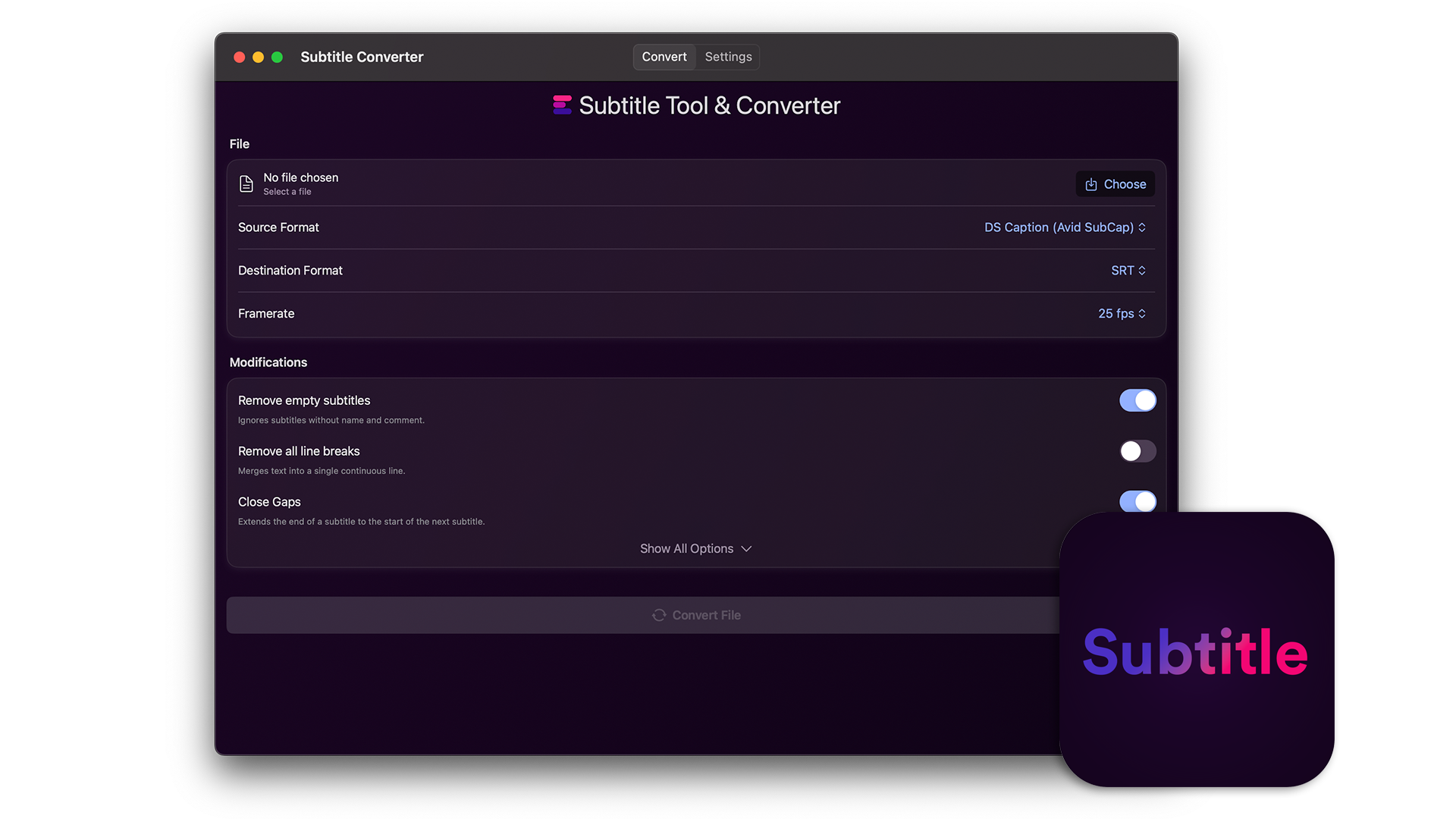 This is a standalone application for macOS and iOS that can be used to convert and modify subtitle files like SRT, VTT, and CSV. Built for offline and enterprise use, it does not require a subscription. Try the free trial version today!
